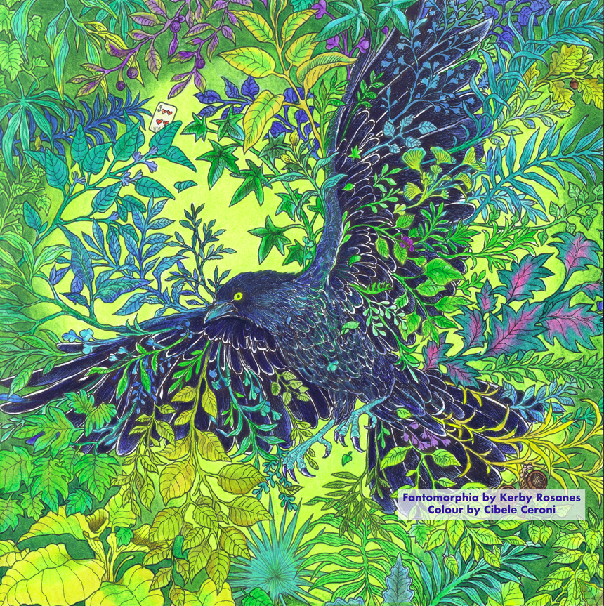 This is an amazing illustration from the book Fantomorphia by Kerby Rosanes. I took my time to finish, there are many details. The challenge was to find colour combinations that would make the leaves come out and not blend in with the background. I mostly chose cool tones – many blues and greens. I used Pablo pencils in the drawing. The background was completed with Derwent Coloursoft. Instead of using a white pen like Posca to highlight the feathers, I simply left that part white. I guess it works. I had fun colouring this page!