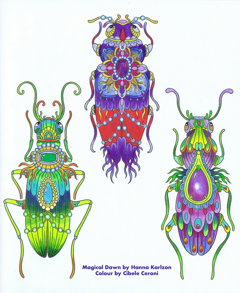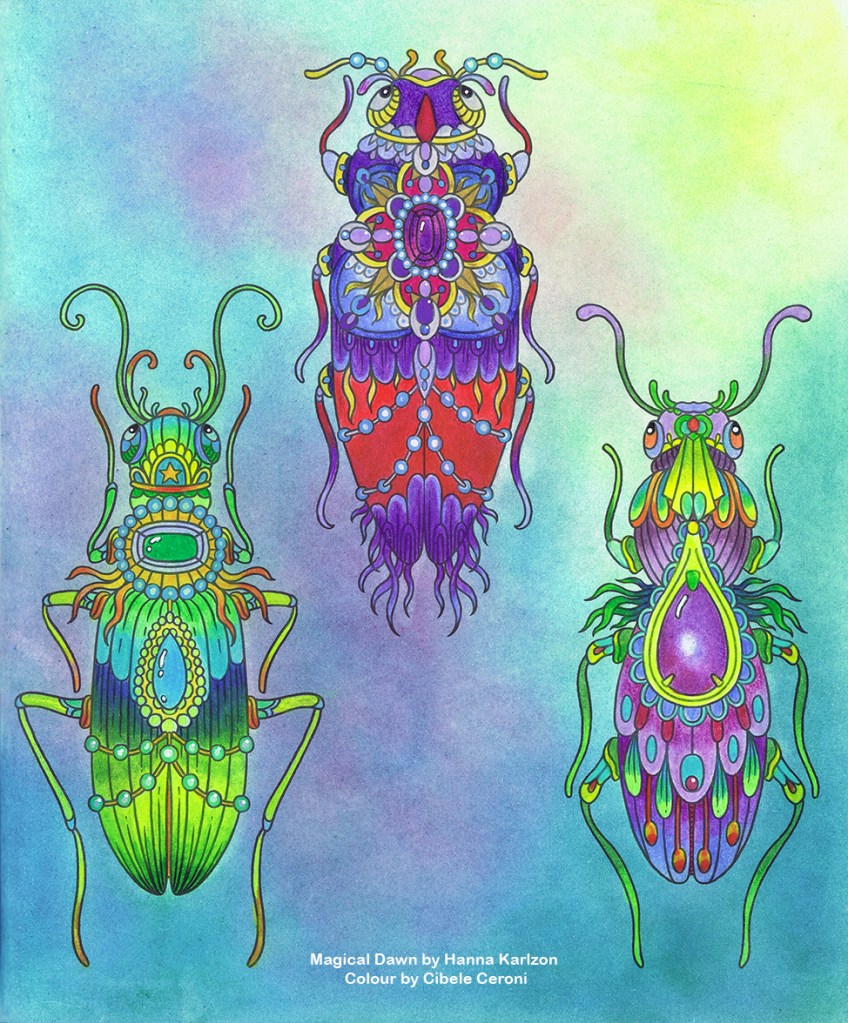 I had a great time colouring this one! I’ve tried to use opposite colours here to bring out the richness of details. Green and orange, red and purple work well when creating contrast. To colour the beetles I used Derwent Lightfast pencils. They are very pigmented and produce beautiful, deep tonalities. I needed only one other pencil to complete my palette, Polychromos Light Cobalt Turquoise. Little details done with Posca Pens.
