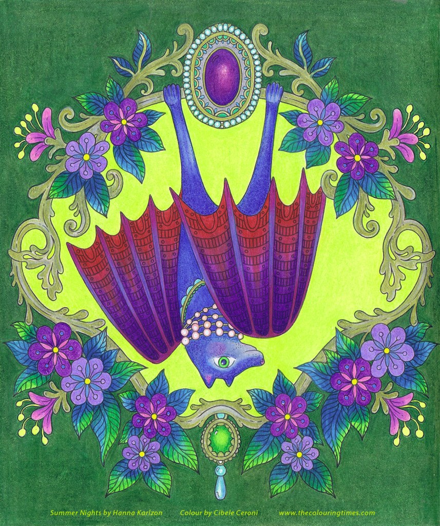 This thrilling illustration comes from the book Summer Nights by Hanna Karlzon. I absolutely love this fabulous bat, hanging in a garland of precious stones and flowers. I had a blast colouring this one!
