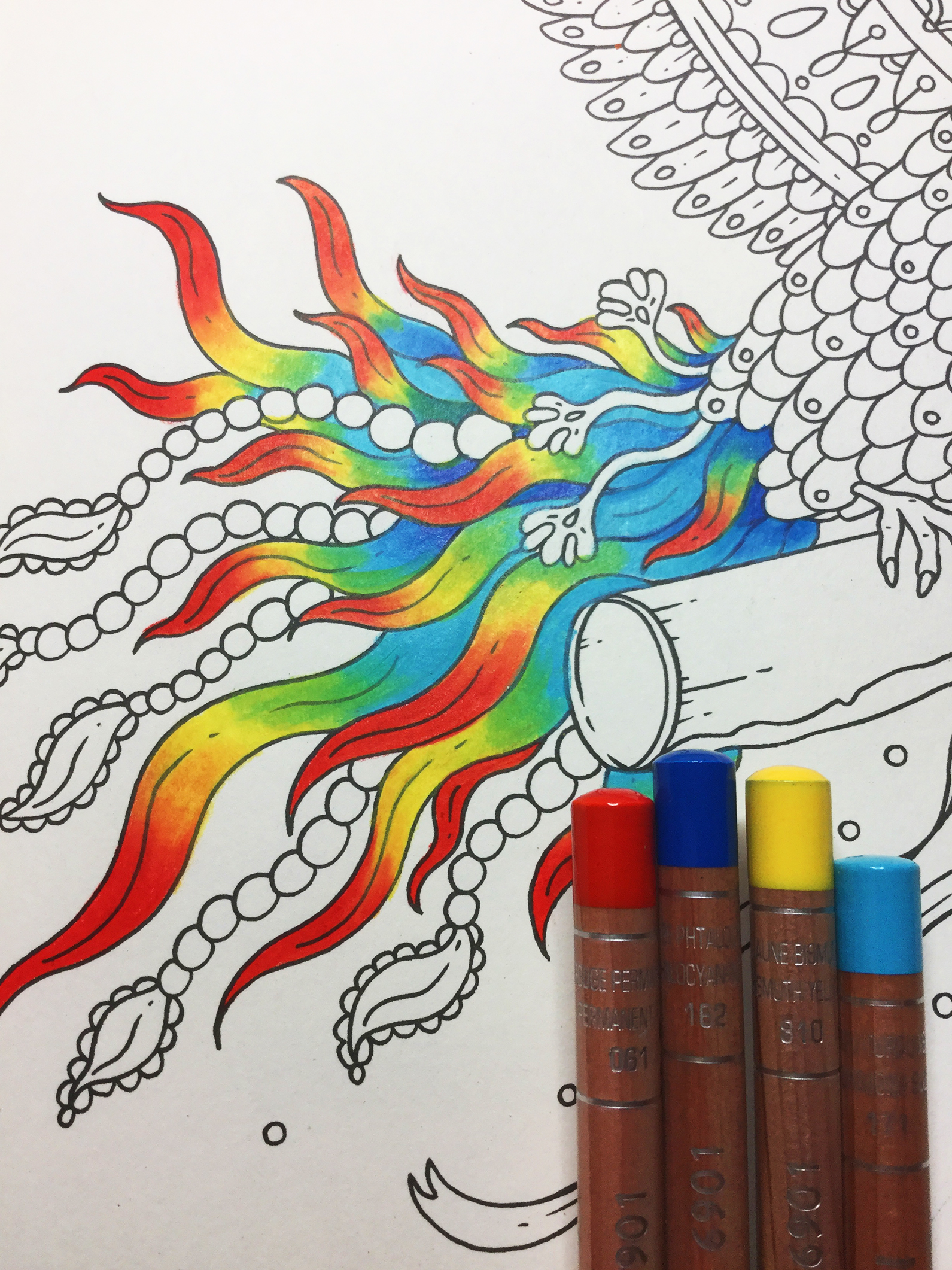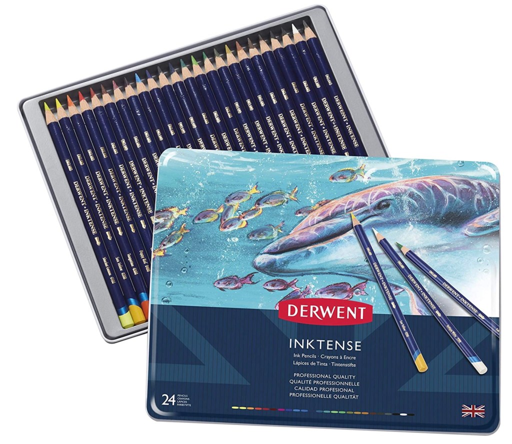 Derwent Inktense are ink pencils activated by water. They are different than watercolours, after using water once they dry quickly and permanently. This allows using layers, because colours can be placed next or on top of each other, no colour bleeding. Bright and rich colours, beautiful. Colouring and drawing with Derwent Intense is a fun experience!