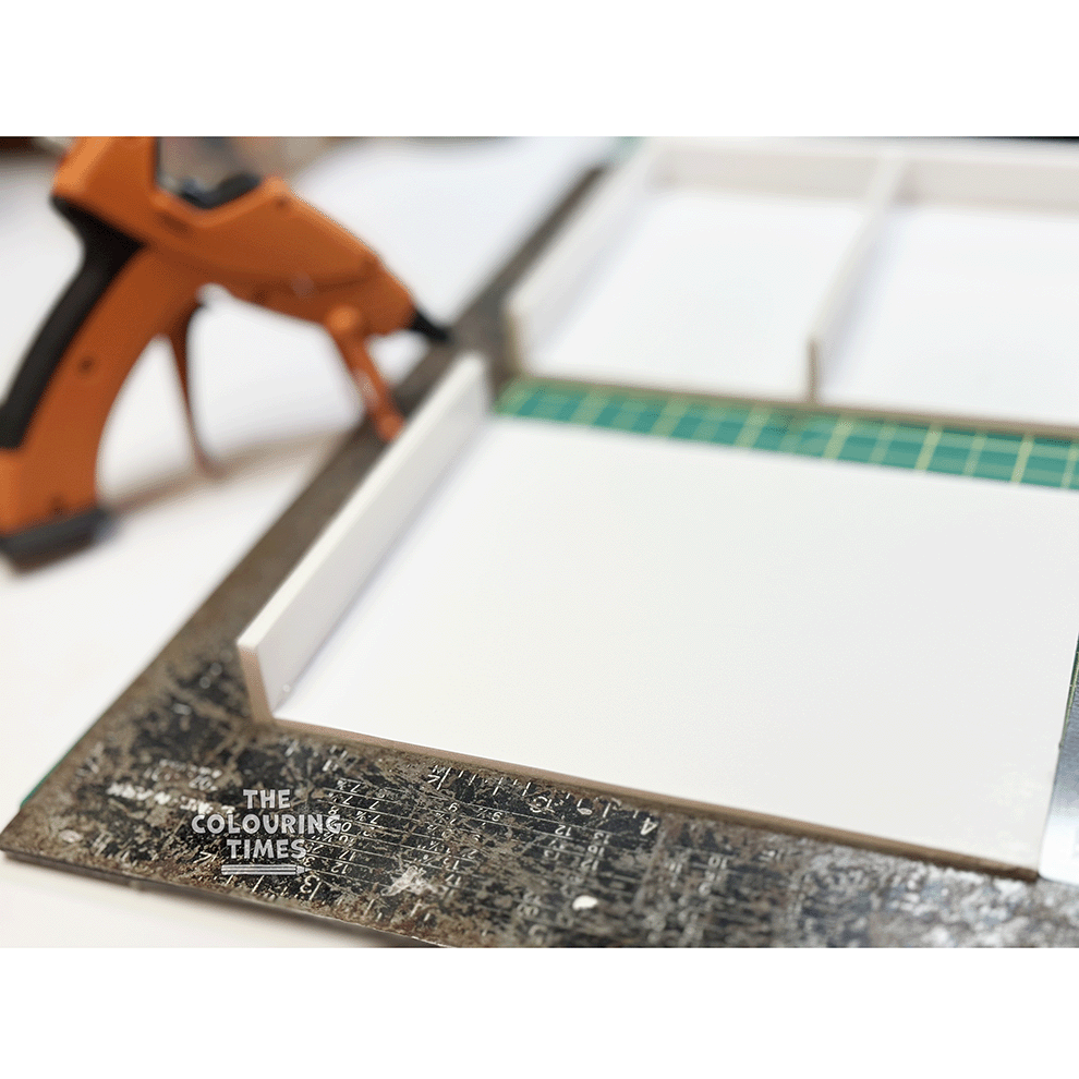 - Glue the back piece to complete the shelf frame. A square ruler is great to keep everything in place when assembling shelves with hot glue.