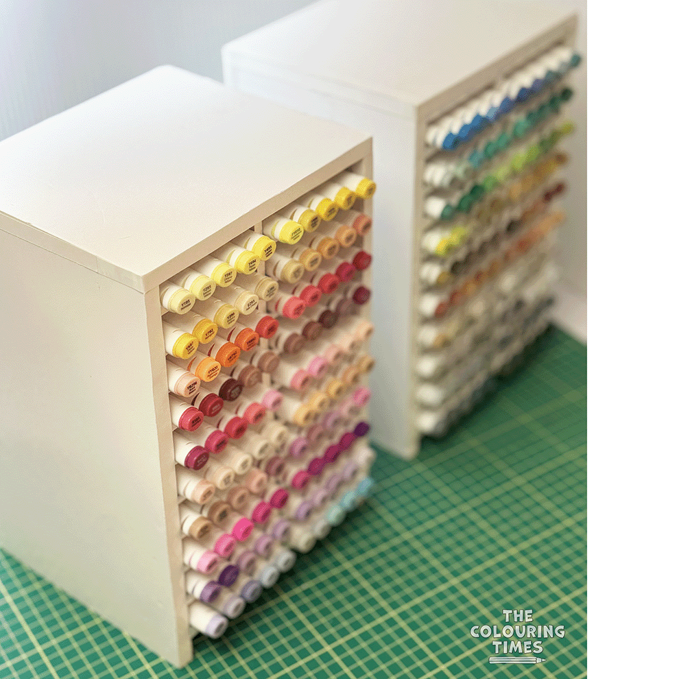 Once my swatch was ready, I started looking for marker storage ideas. I wanted something that would keep them horizontal, easy to access, and well organized โ plus lightweight and modular, so I could expand later and still have it looking good.