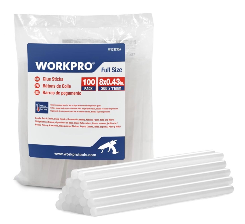 - WORKPRO Full Size Hot Glue Sticks, 100-pack, 0.43×8 Inches, Compatible with Most Glue Guns