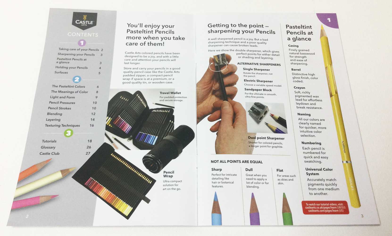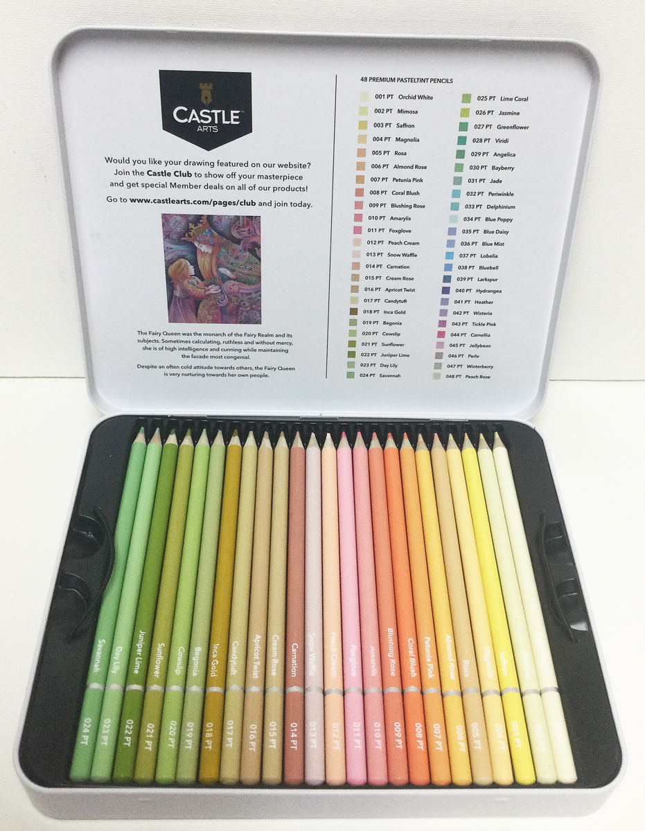 When I opened the tin, I found five cards and booklets inside. Castle Club Card, a tester sheet for your new pencils, a Colour and Product Guide, a Pasteltint Pencils Guide and an Illustration guide step by step.