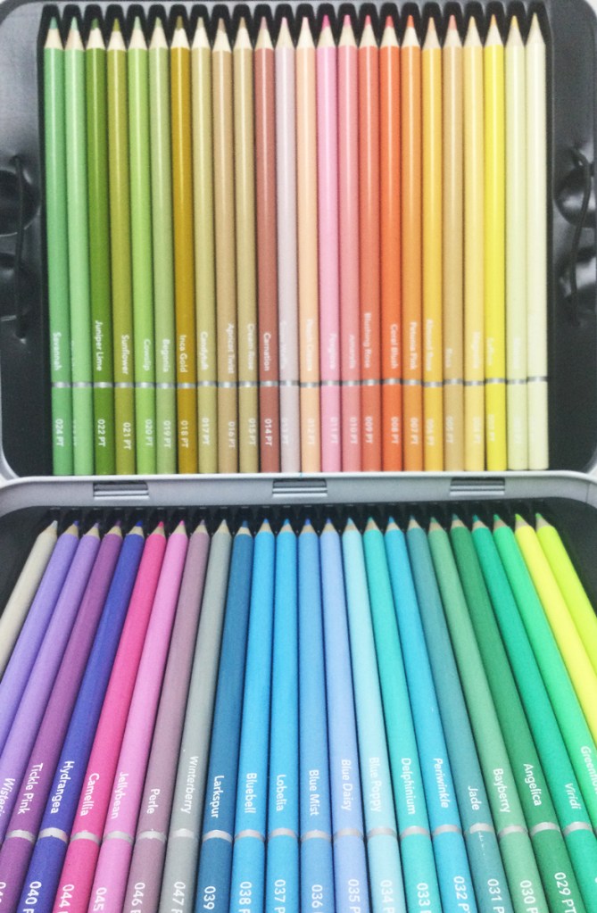They are not pastel pencils like Pitt Artists‘ Pastel Pencils by Faber Castell. Pastel pencils are pigment-based with very little binding agent, very dry, no waxes or oils. That’s a different medium.
