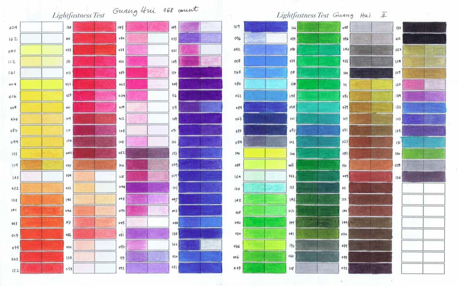 Here’s the image of my colour chart after 30 days exposed to sunlight. The column at the left was covered for comparison. Click on the image to enlarge:
