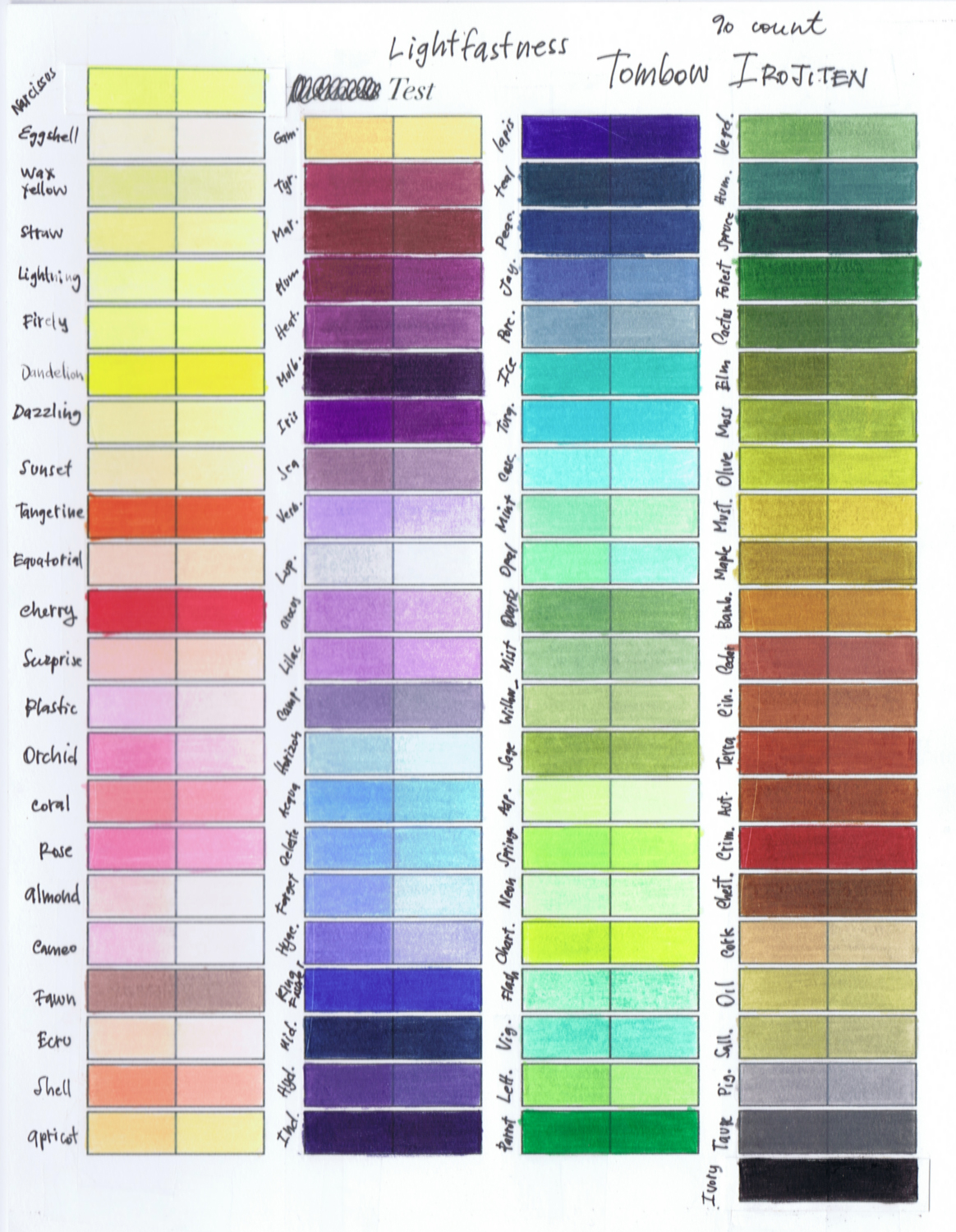 Here’s the image of my colour chart after 30 days exposed to sunlight. The column at the left was covered for comparison. Click on the image to enlarge: