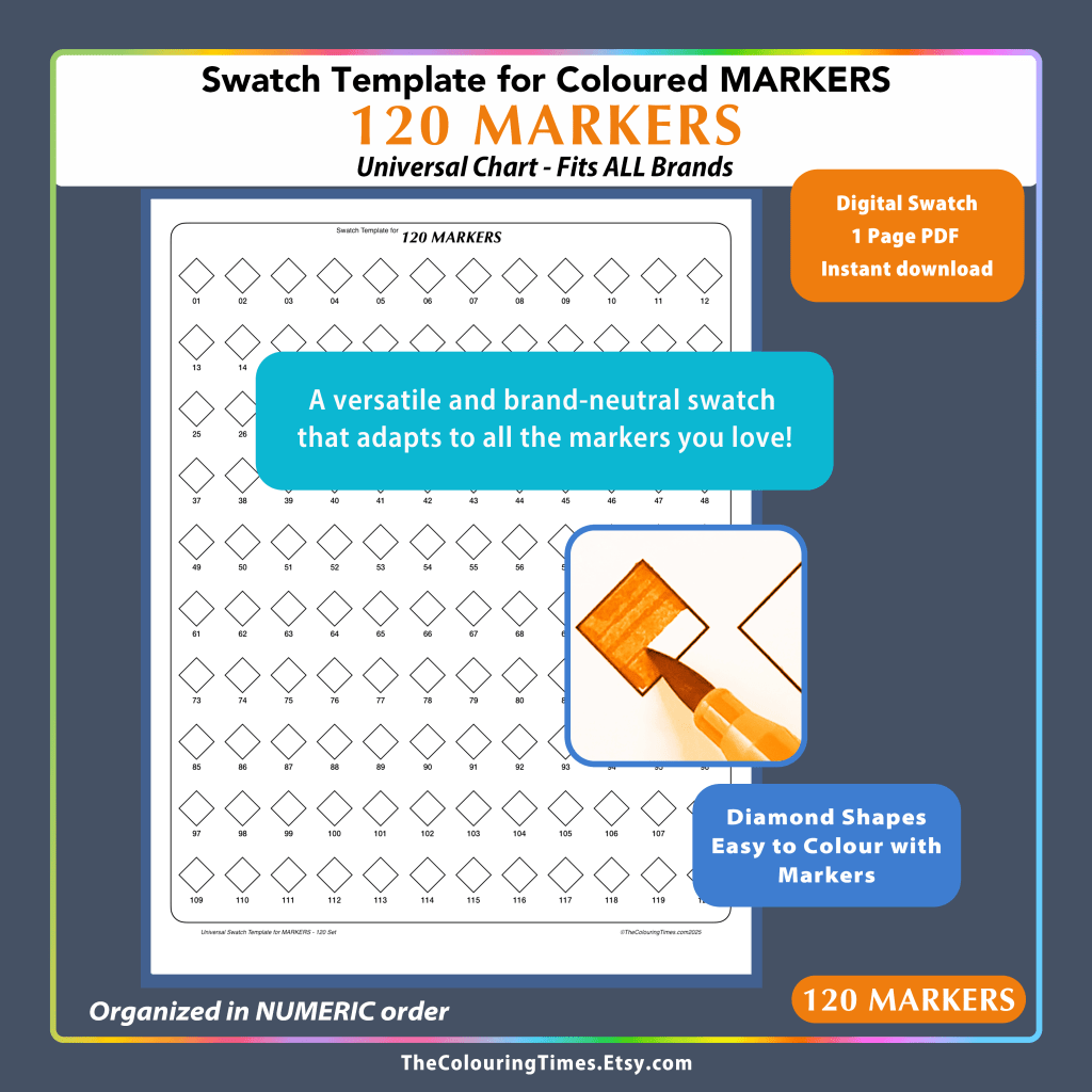 - PDF Swatch Pack for 120 Markers – Marker Organizer – fits all brands